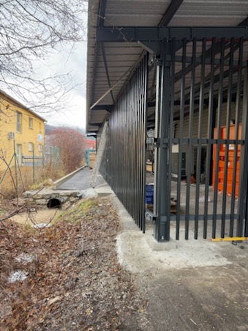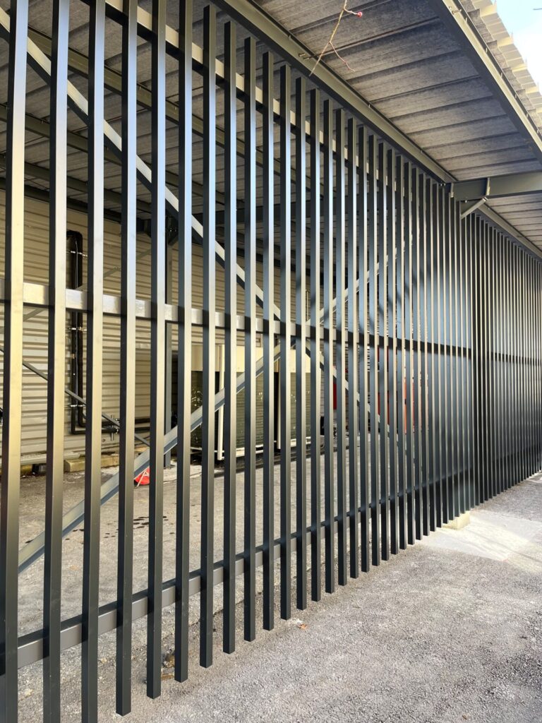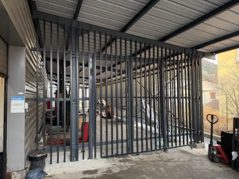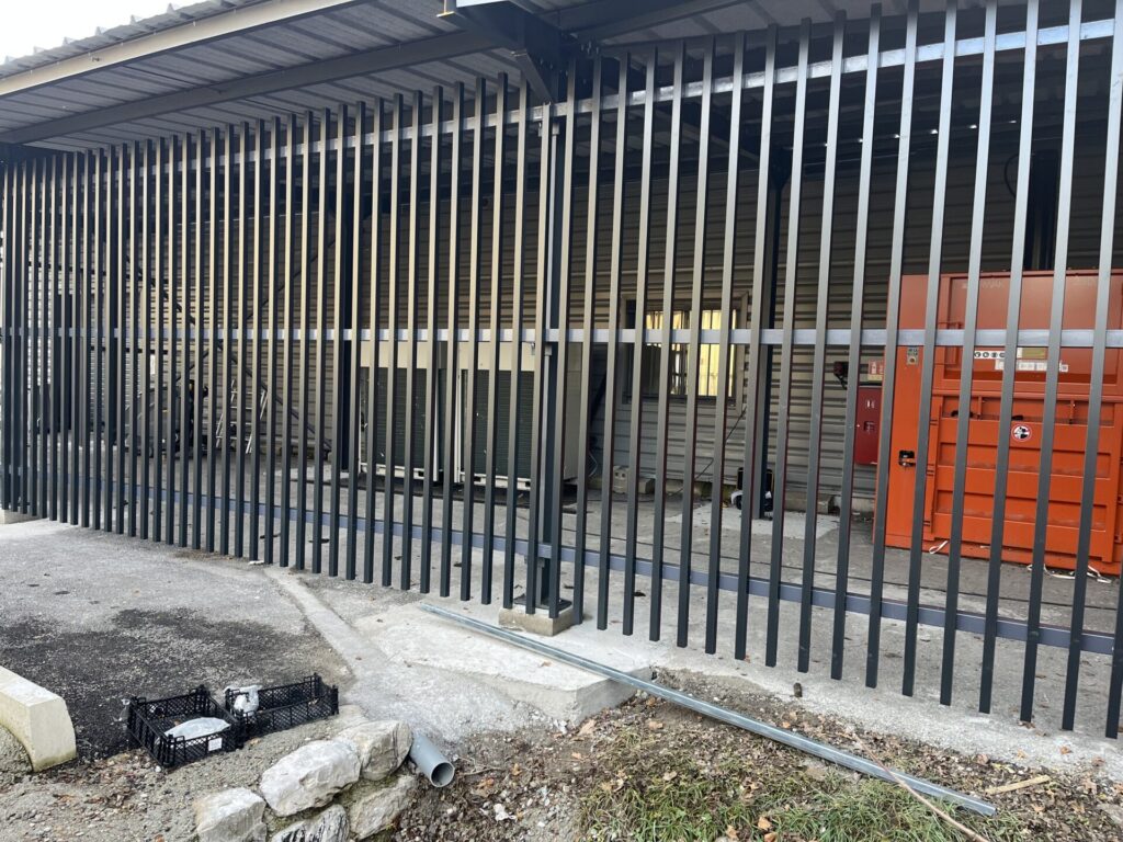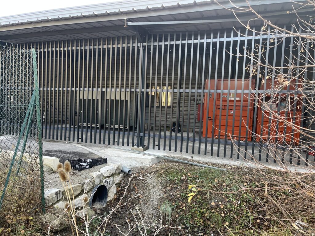 Création d’un espace pour la presse à carton et les chariots au Super U de St-André-les-Alpes. Mise en place d’une ossature, d’une couverture et des habillages en barreaux verticaux sur les trois côtés, incluant les portails d’accès